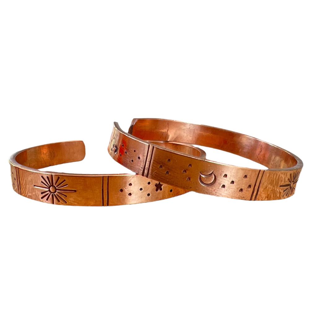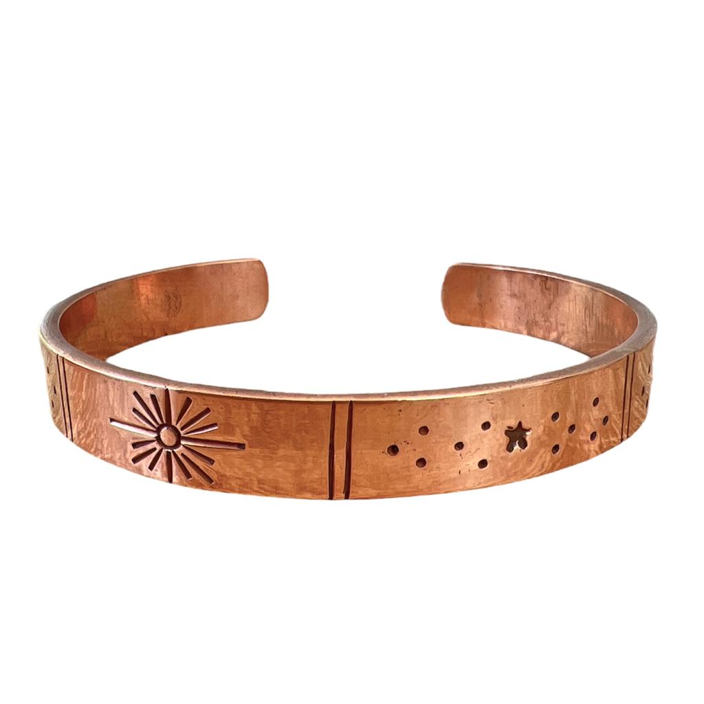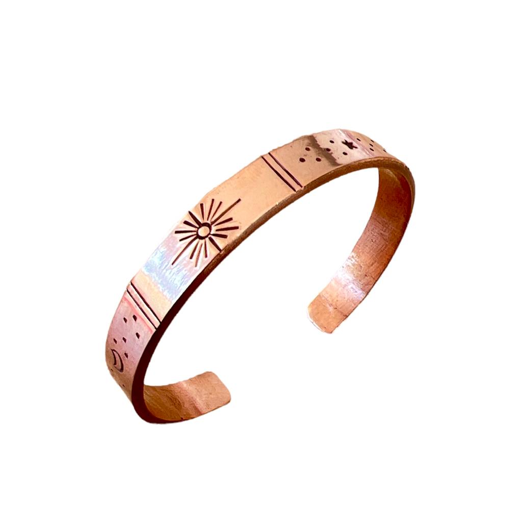 Hecha a mano con un hermoso diseño de universo, esta bella pulsera al ser 100% de cobre se relaciona con la reducción del dolor y el aumento de la fuerza articular.