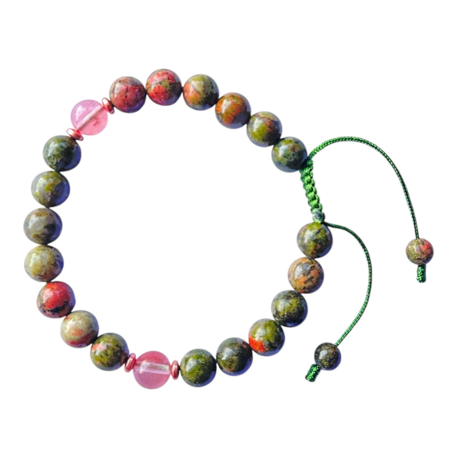 Cada Pulsera Mala de Unakita con Cuarzo Cereza y Rosa es única, elaborada con cuidado y dedicación, reflejando la armonía entre naturaleza y tradición tailandesa 🌿💖